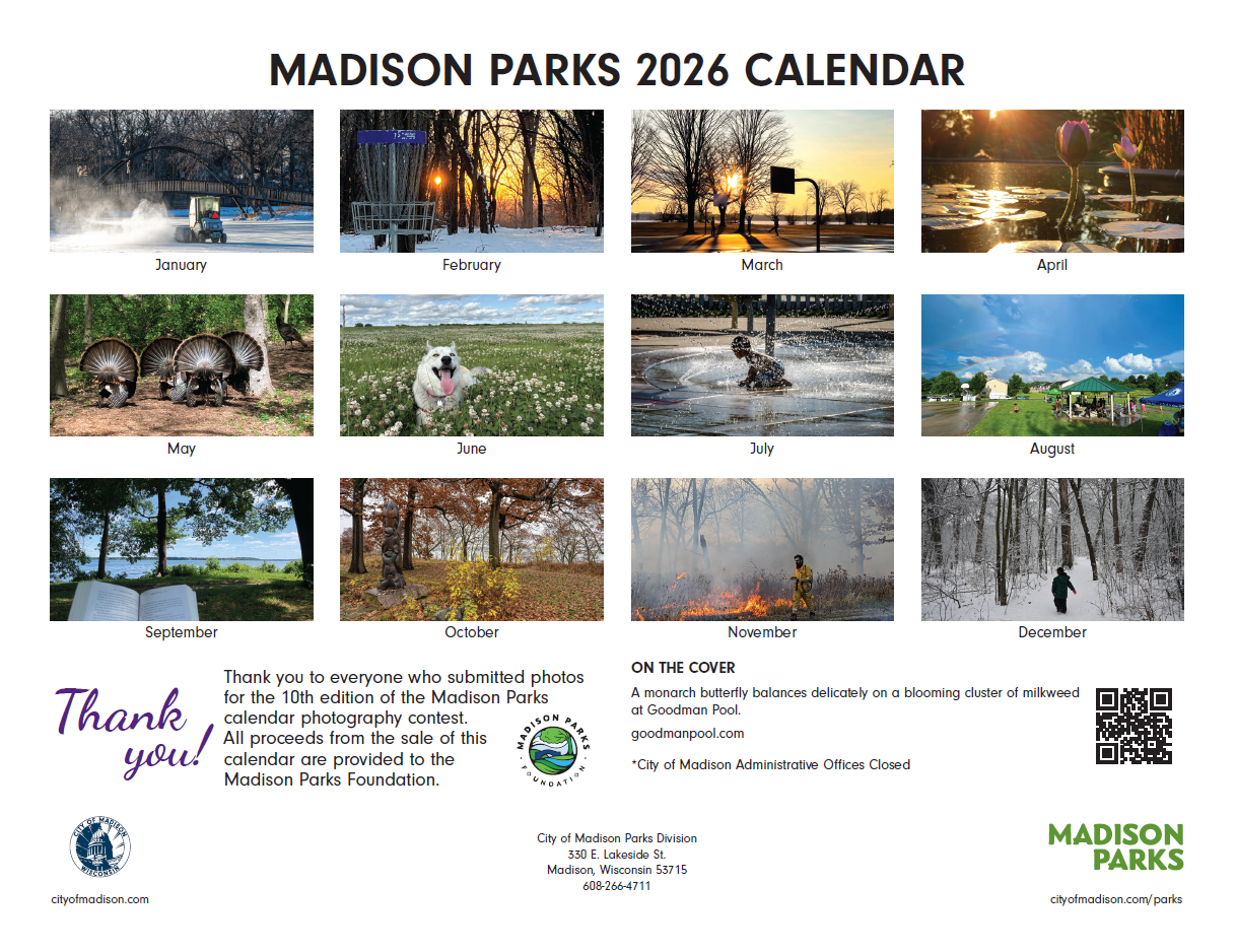 Madison Parks is seeking photos of people enjoying activities such as hiking, snowshoeing, skateboarding, and golfing in Madison parks for the annual wall calendar. Submit qualifying photos by Monday, September 7, 2026. Judging occurs in September, and the winners are announced in the fall. Winners receive one free calendar per winning photo.