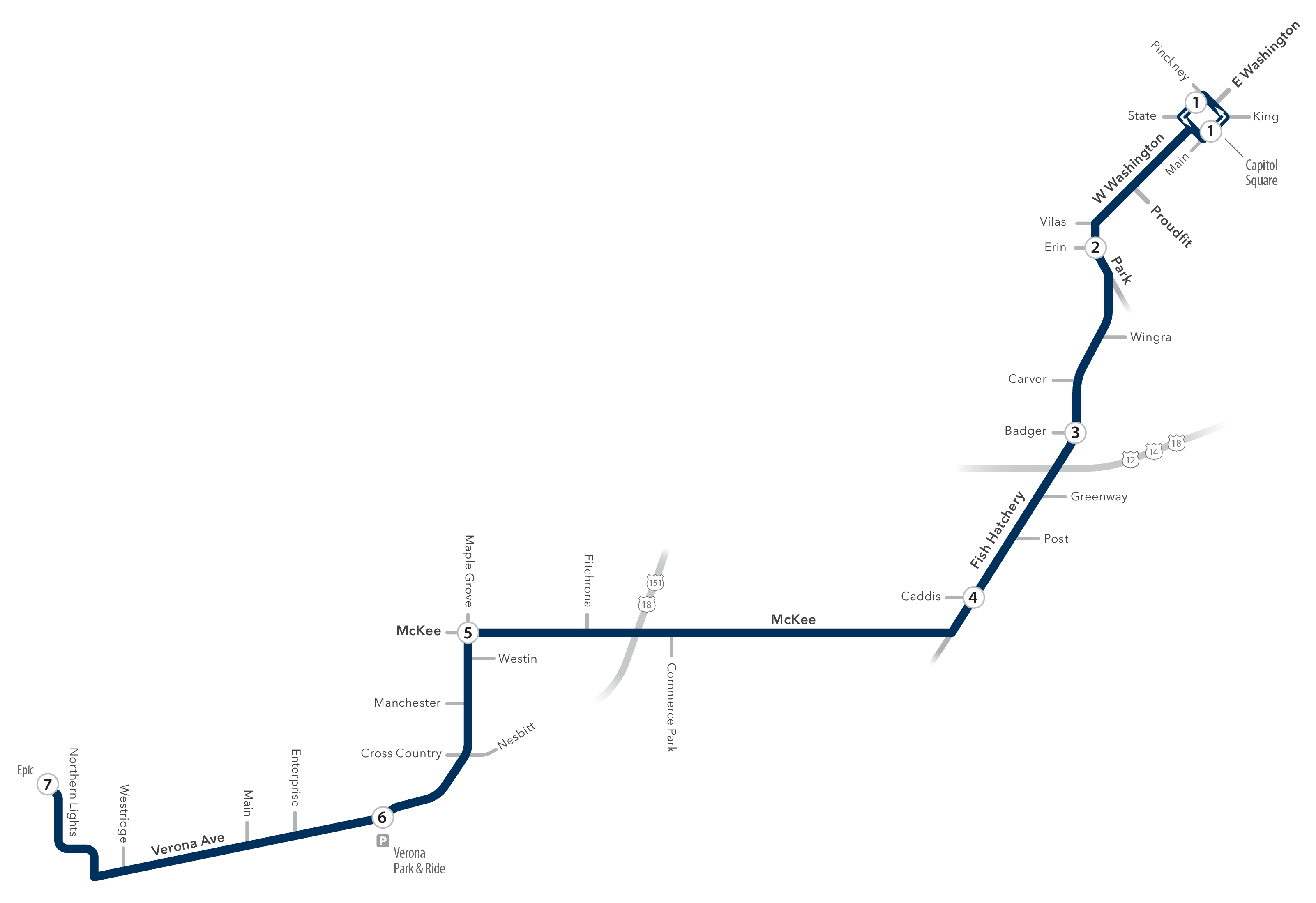 Servicio entre el Capitolio y Epic via West Washington, Park, Fish Hatchery, McKee, Verona Rd., Verona Ave., Epic Lane, y Northern Lights.