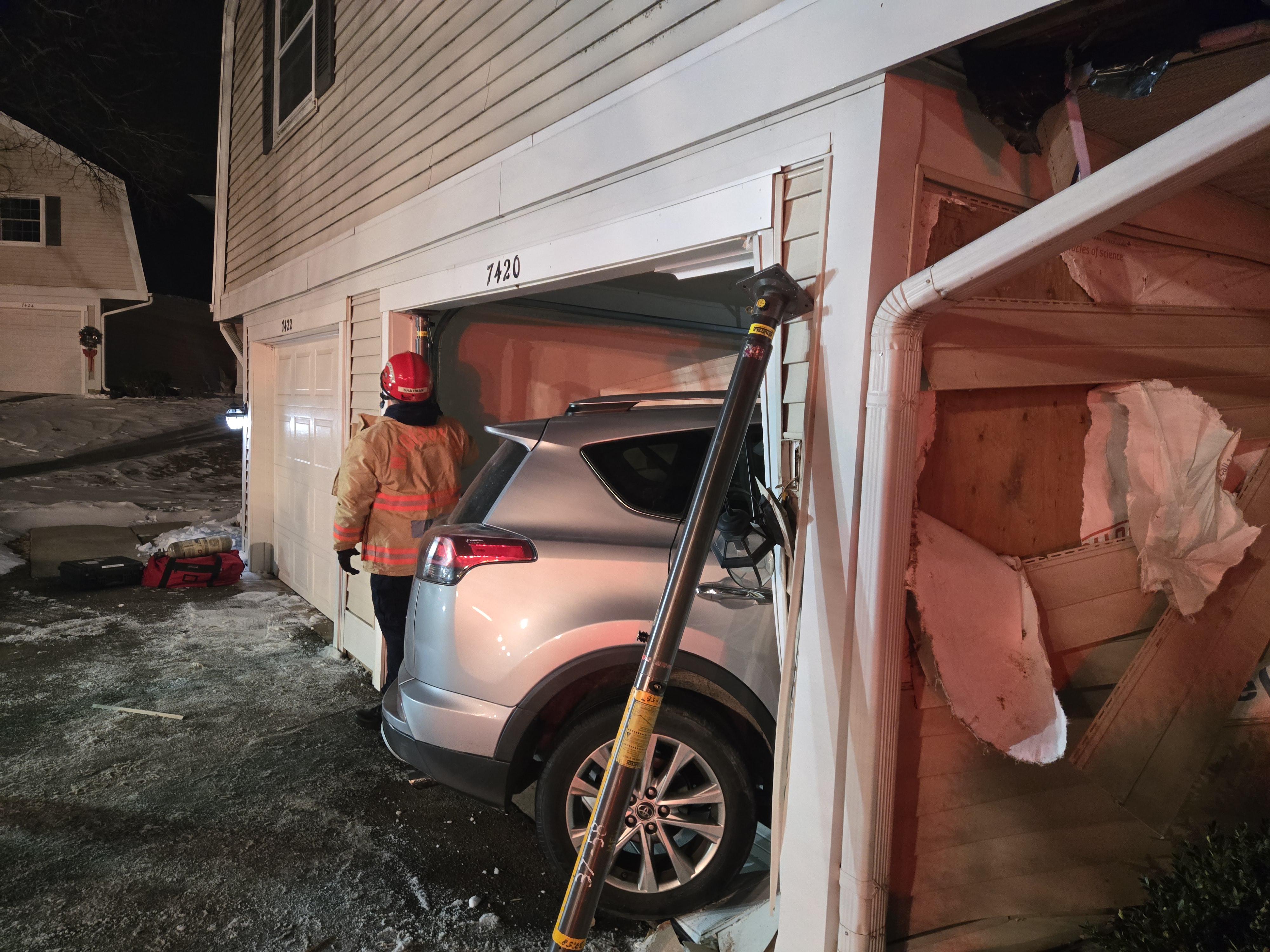 The car had impeded far enough into the garage that Ladder 2 was concerned about the safety of the building and called for the Heavy Urban Rescue Team (Engine 8 and Squad 8) and the command car (Car 31).  Upon arrival the HURT Team determined that temporary structural supports would have to be put in place to remove the car.  Once the car was removed, HURT assessed the structure for more damage but determined that the building was safe for all occupants to stay. No one was displaced because of the accident.  Crews were on scene for just under 2 hours confirming the safety of the building and occupants.