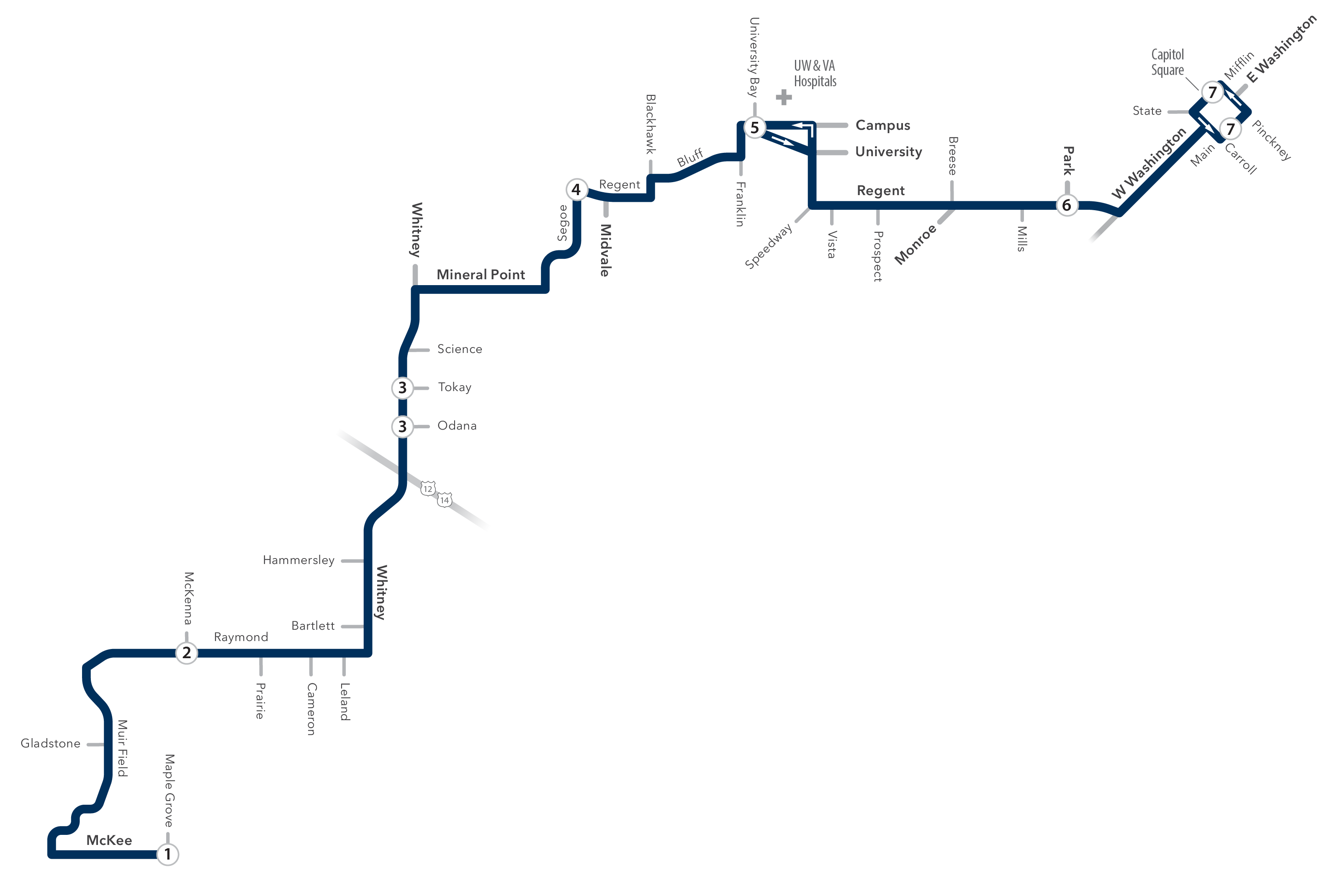 McKee, Muir Field, Raymond, S Whitney, Mineral Point, S Segoe, Regent, Bluff, Franklin, University, Highland, Regent, W Washington, Mifflin, Main, and Pinckney.