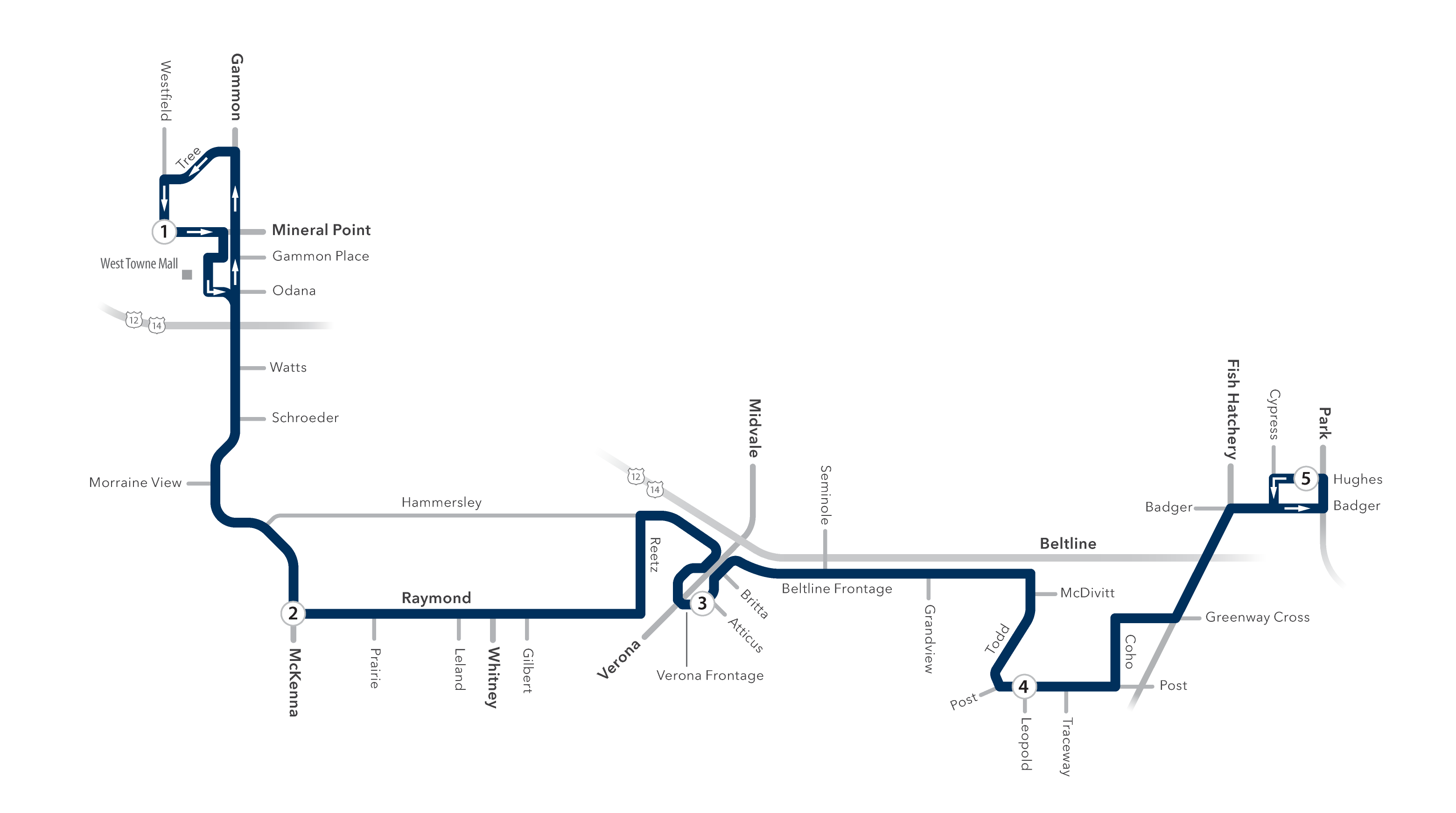 Westfield, S Gammon, McKenna, Raymond, Reetz, Verona Frontage, Beltline Frontage, Todd, Post, Coho, Greenway, Fish Hatchery, W Badger, and Hughes.