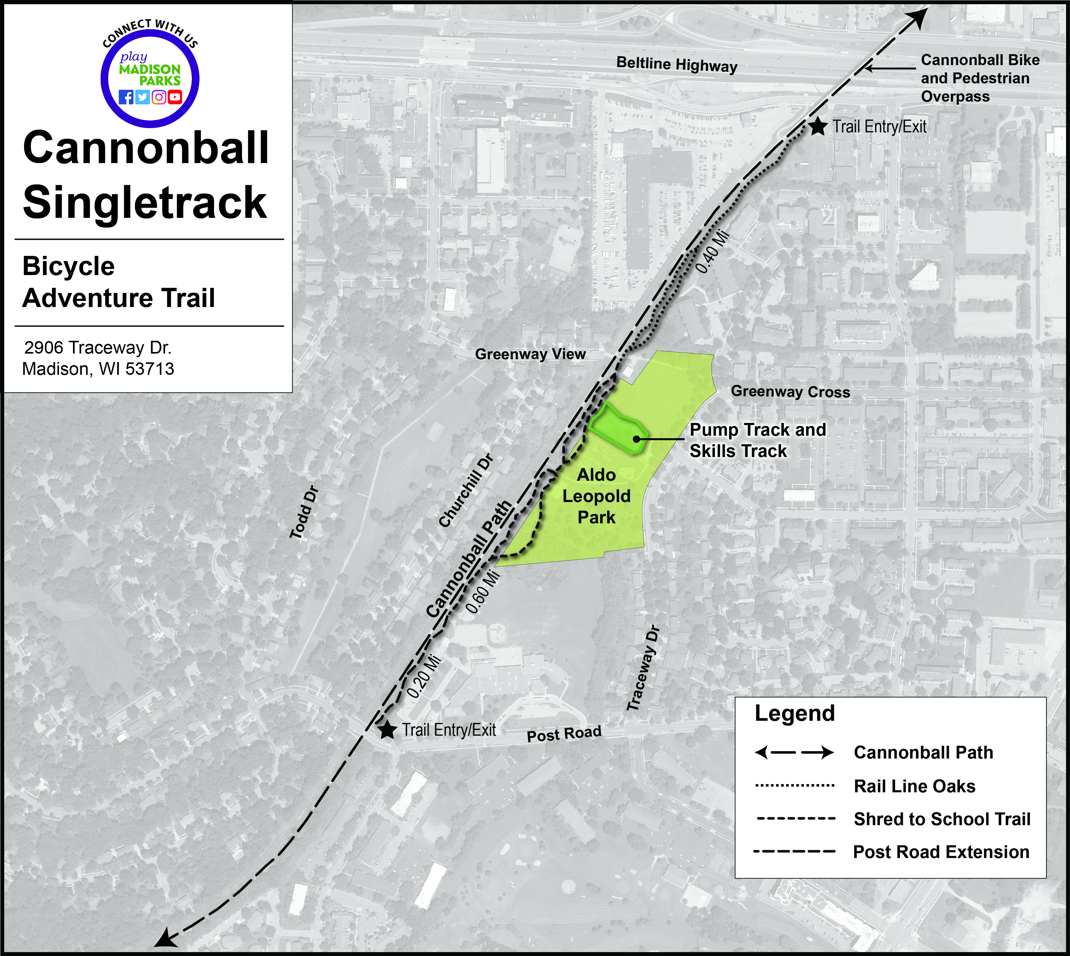 Running parallel to the existing Cannonball Path, the Cannonball Bicycle Adventure Trail offers a unique and fun biking experience for all skill levels. The narrow trail or “singletrack” is about the width of a bike and provides adventures for riders with “shred to school,” hills, jumps, decking and berms through woodsy natural, limestone and chip seal trails. The adventure trail is approximately one mile and runs north from Post Road to just south of the beltline (Hwy 151) and has several access points, including at Aldo Leopold Park. Trail conditions are periodically posted by users on CORPTrails.org.