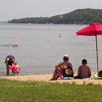 Regular beach season has ended. People may swim at their own risk. Blue-green algae (Cyanobacteria) may be present and their levels can change depending on the waves and wind. Always take a look at water conditions before you or your pet enter the water and avoid contact with algae blooms.