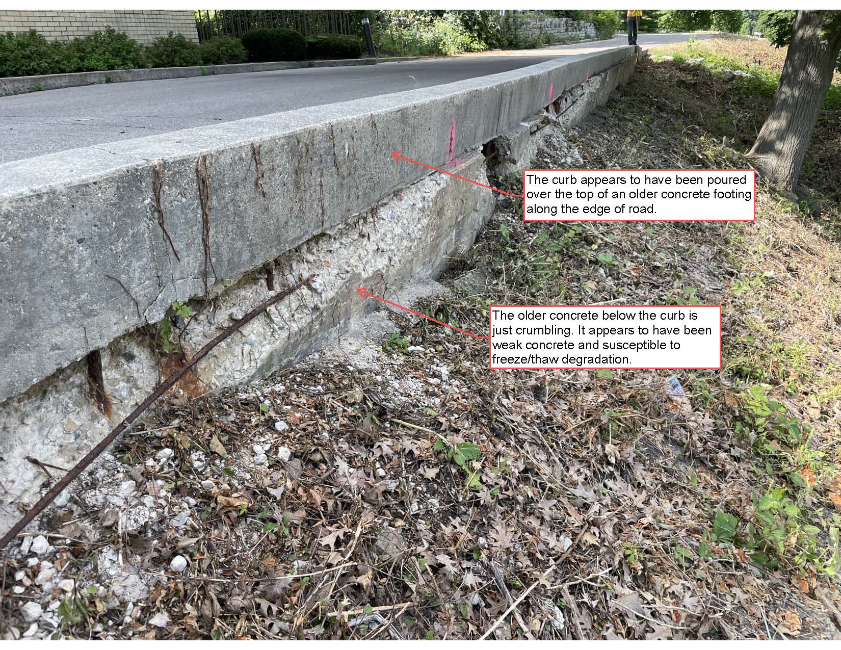 This wall is currently in poor condition and is starting to fail. The wall supports the access drive to the apartment building and serves underground parking. Additionally, it's the designated fire access route to the building.