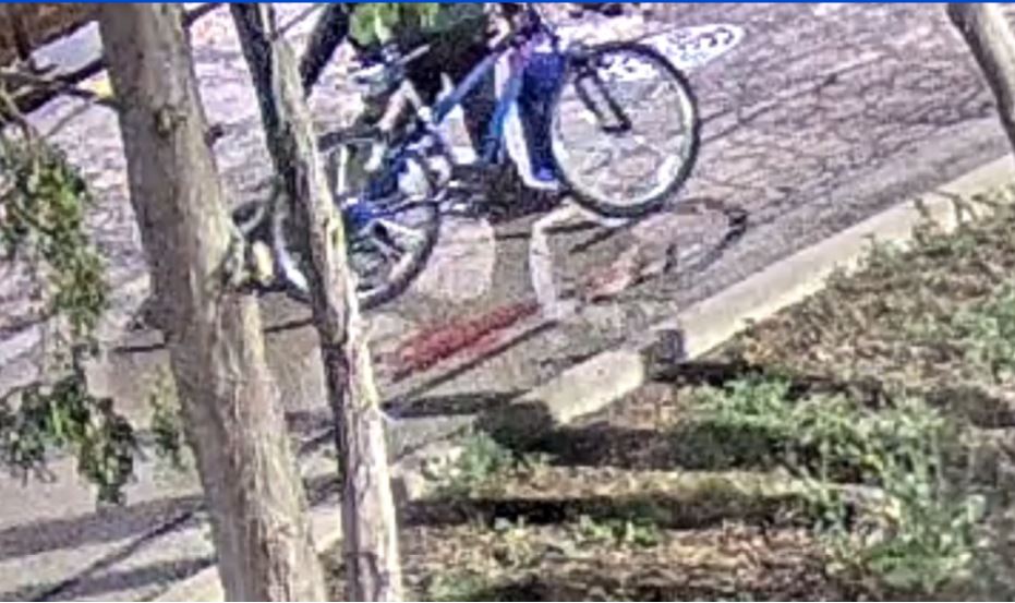 In one of these crimes, one of the suspects was riding a blue bicycle.